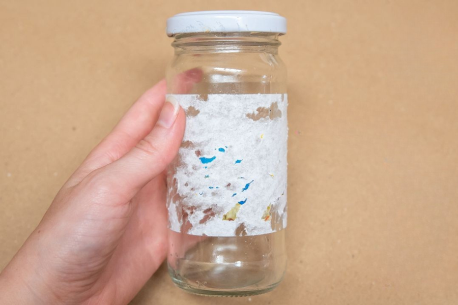 Para iniciar, é necessário fazer um pequeno furo em um suporte onde a luminária será instalada. Em seguida, o tampo do pote de vidro também deve ser perfurado para permitir a passagem dos fios.
