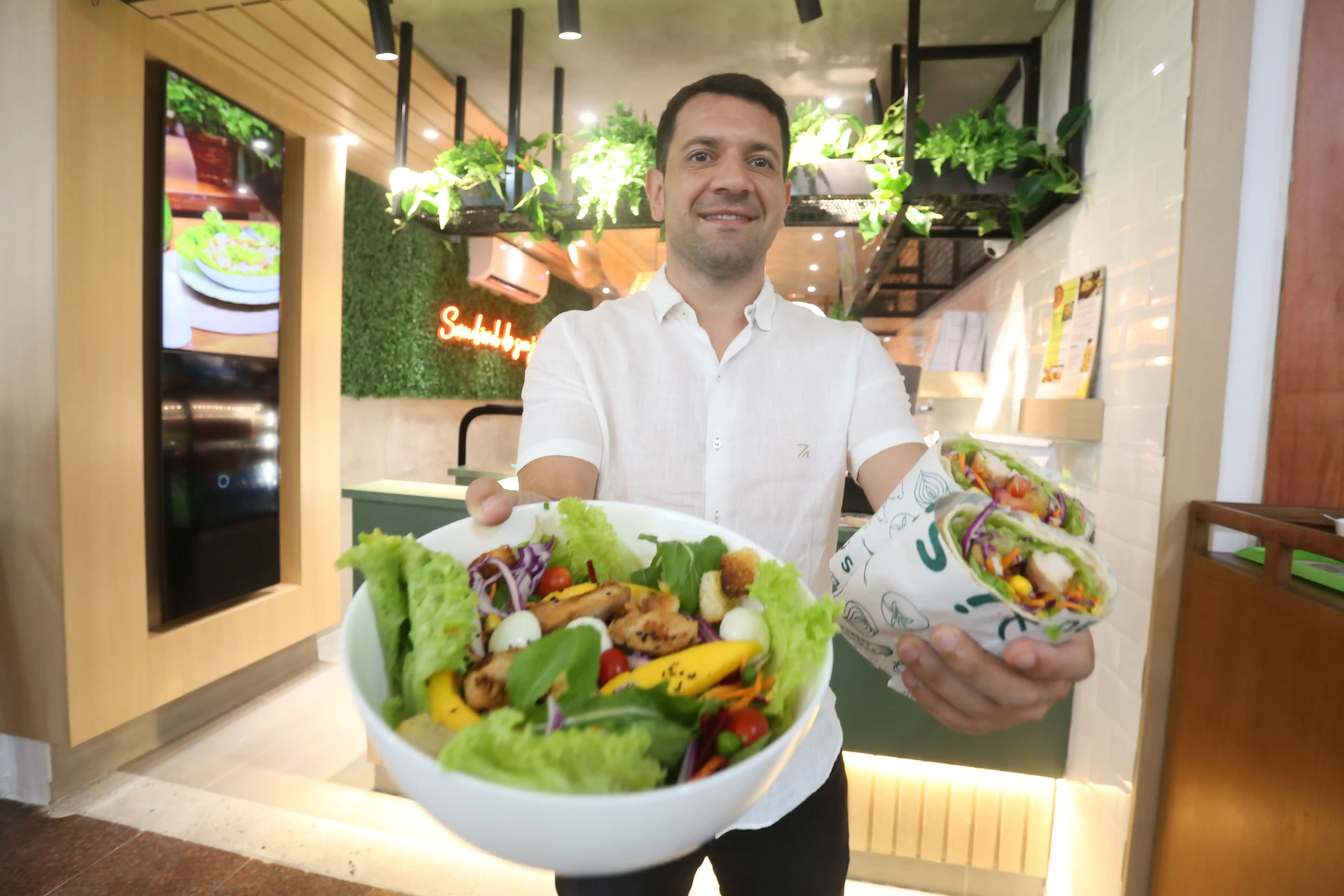 “Nossos ingredientes são frescos e de qualidade, com verduras, legumes e frutas do dia, tudo na melhor forma possível, com nada sendo industrializado. Faremos tudo de maneira artesanal e com a qualidade que sempre prezamos. Temos um cardápio bem completo e uma operação que facilita a vida do cliente. Cada um poderá montar sua salada da forma que preferir. Como nossa operação no ponto de venda será por quilo, a salada poderá ser feita com os ingredientes que o cliente preferir e na quantidade que ele desejar. A mesma coisa vale para os nossos wraps. Para aqueles que querem mais rapidez no pedido, teremos opções de saladas e wraps prontos. Além disso, contamos com opções de macarrão integral, quatro tipos de risotos, diversas opções de sucos, água de coco, saladas de frutas e açaí. Fora isso, vamos ter um empório na loja que vale a pena conferir”, explica Murilo.
